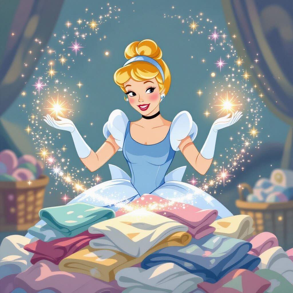 This image shows Cinderella as a magical maid, casting a spell over a laundry pile in a whimsical, painterly style. Vibrant pastels and an ethereal glow create an enchanted scene.