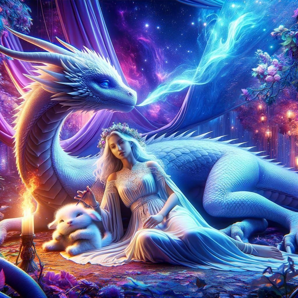 This image shows a Caucasian girl with perfect anatomy sleeping next to a white dragon. The scene is set at night and rendered in high resolution with a magical, artistic aesthetic.