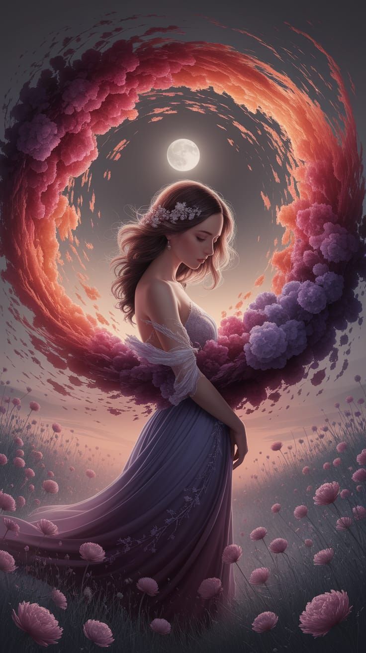 This image shows a woman surrounded by swirling colors in a dreamlike dawn. She displays longing and sorrow, set against withered blooms in a melancholic dusk, rendered with flowing lines in an Art Nouveau style.