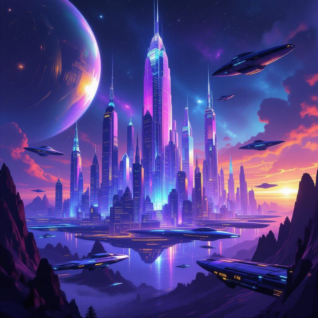This image displays a vast, epic cosmic city with glowing crystalline skyscrapers floating over a neon alien world. It features vibrant purple, blue, and gold hues, with intricate details in a concept art style.