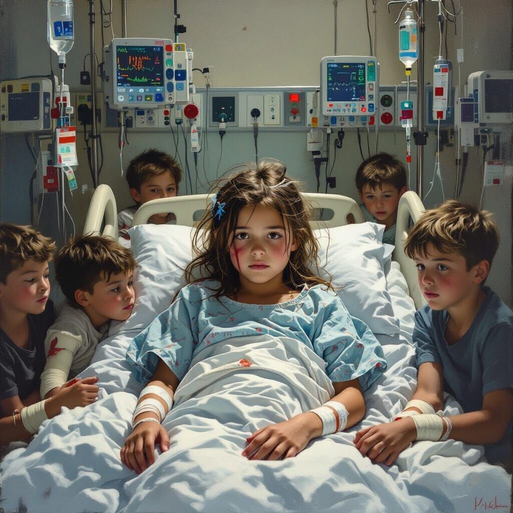 This image shows a frail young girl in a hospital bed, surrounded by other injured children in a clinical ward. Medical equipment emphasizes the somber, realistic atmosphere. Rendered with meticulous details.