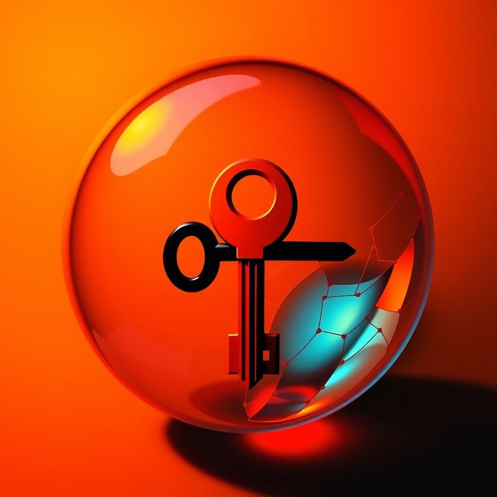 This image shows a fluorescent orange orb containing a black key, emitting an ethereal light. The artwork features cubist elements of geometry, rendered in bold, vibrant colors as an abstract surreal dream.