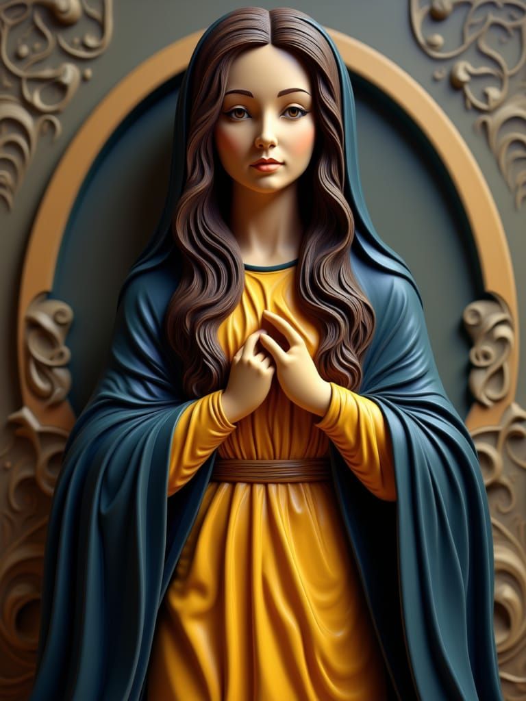 This image depicts a stunning polychrome wooden statue of the Virgin Mary, showcasing intricate details of her facial features, hair, and flowing garments. Rendered with volumetric lighting, it evokes Renaissance sculpture with Baroque drama.