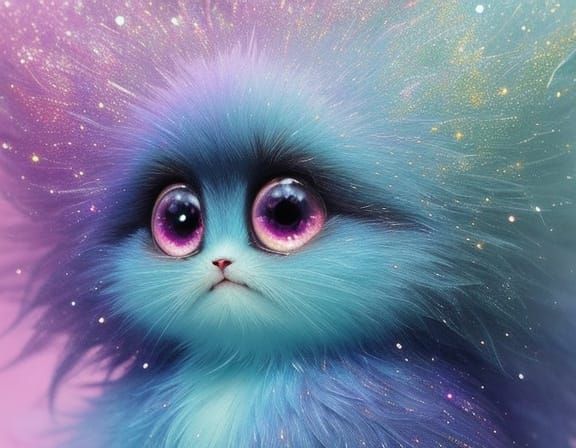 This image shows a fluffy monster with big, innocent eyes sitting in sparkling glitter. Features a pastel color palette with vibrant pops, rendered in a charming, whimsical illustration style.