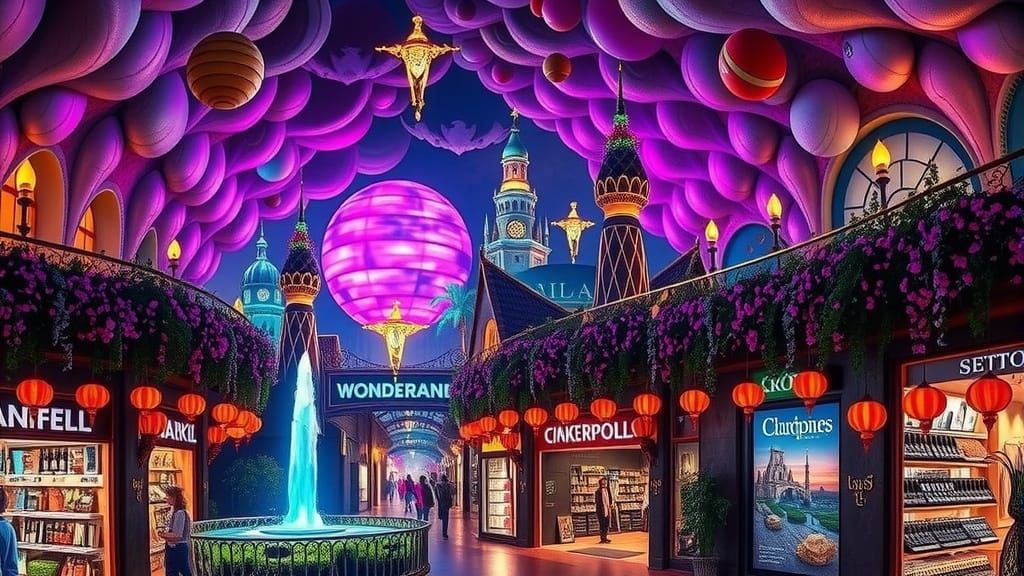 A vibrant city existing in a dreamlike underworld. This image captures a fantasy realm reminiscent of Wonderland, with a lively atmosphere and focus on love.