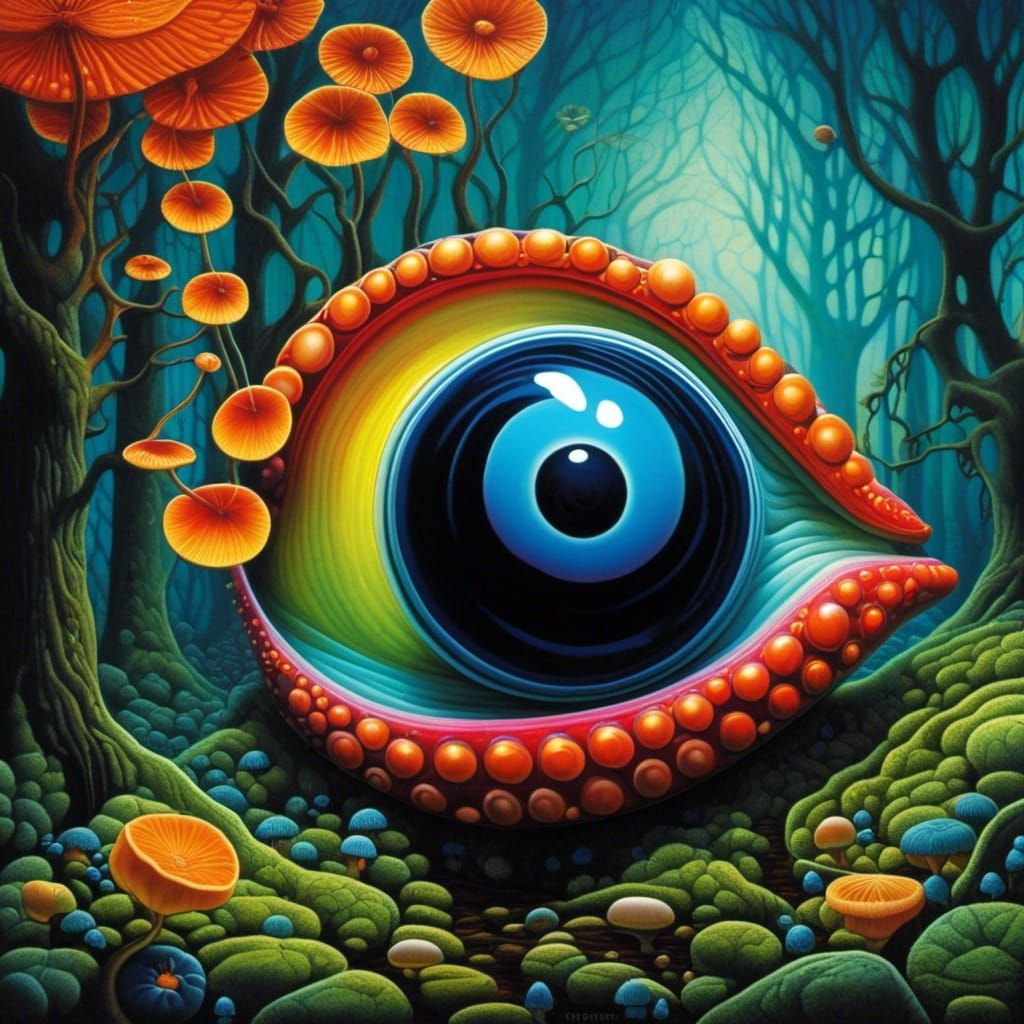 A surreal image of a snail with an enchanted forest inside its shell created using double exposure techniques. The artwork features deep saturation, high contrast, and crisp lines.