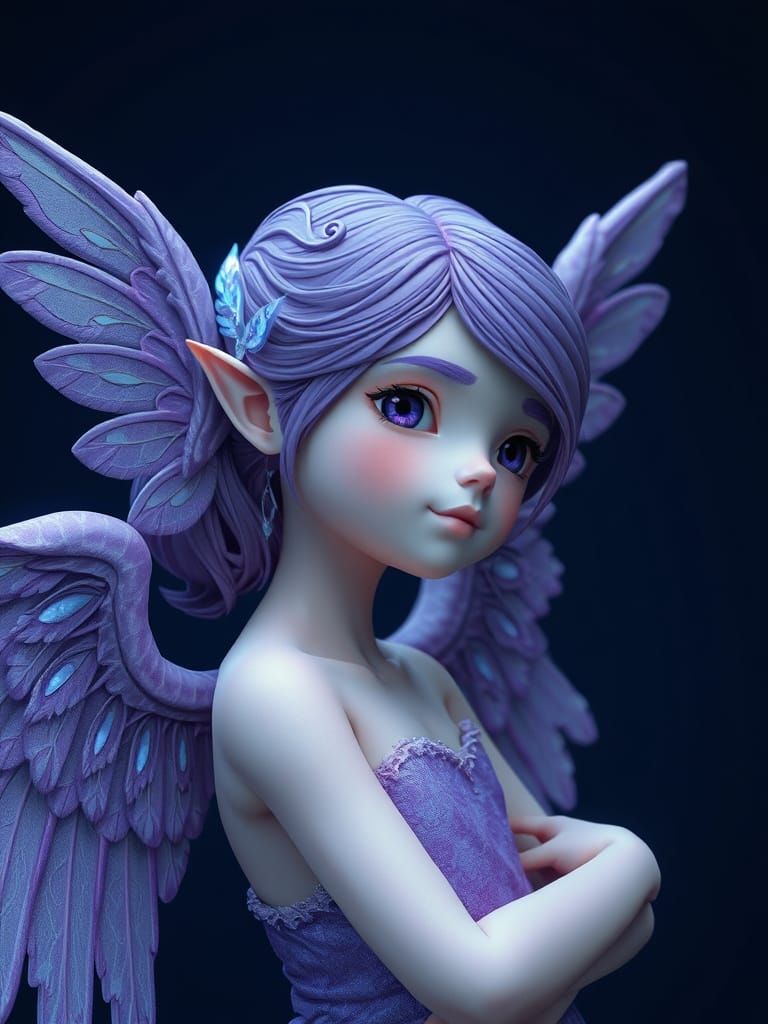 This image shows a violet-colored girl with angel wings set against a dark blue background. The hyper-realistic 3D image features detailed and precise textures, with majestic lighting, as high-definition digital art.