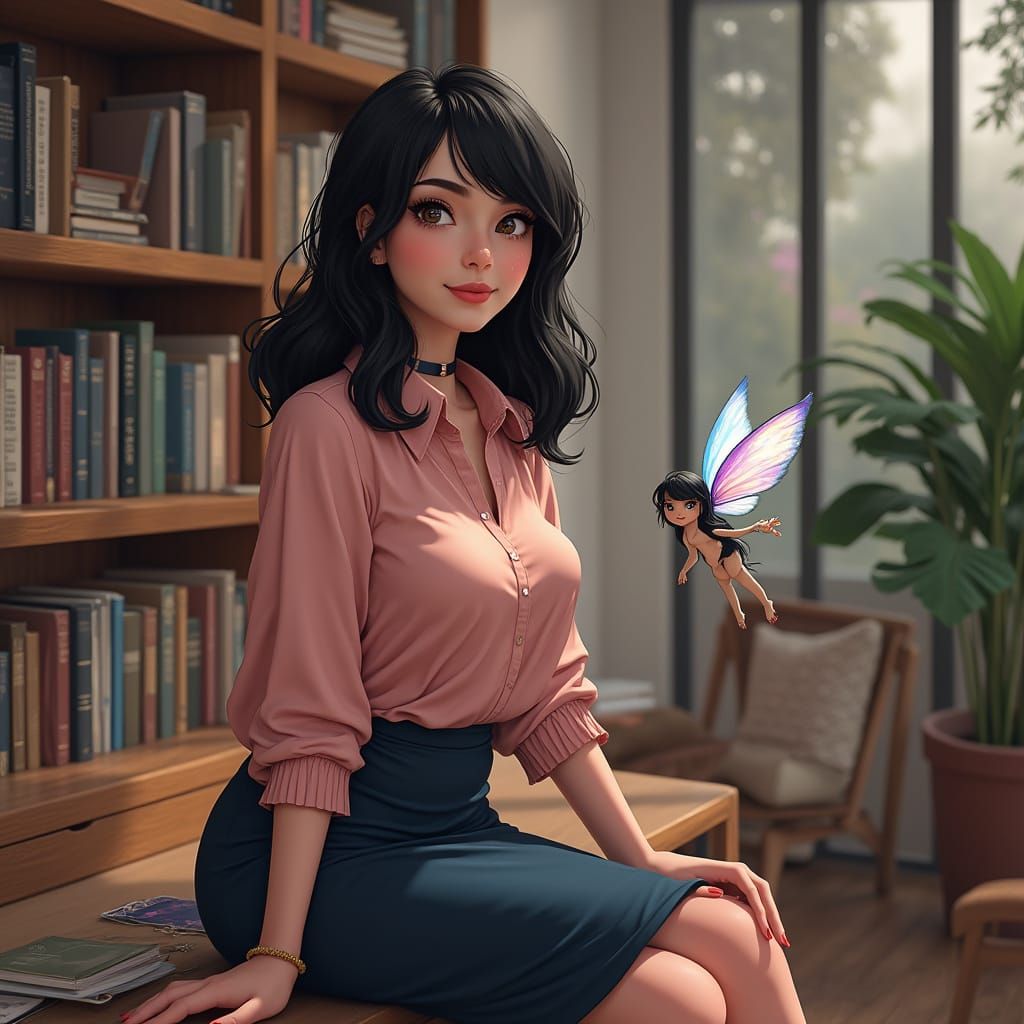 A hyperrealistic image features a 30-year-old Spanish woman with dark hair and eyes, dressed in a rose blouse and blue skirt, inside a modern library. A pixie with iridescent wings is perched nearby.