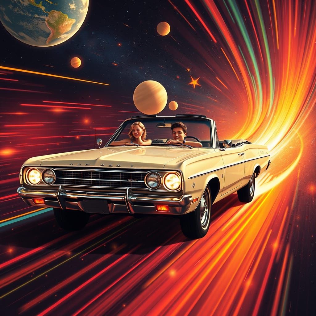 This image depicts a vintage convertible car soaring through a kaleidoscopic cosmos, surrounded by psychedelic colors and dynamic cosmic rays. Two young adults recline in the car, surrounded by a dreamlike aura, evoking a sense of wonder and freedom.