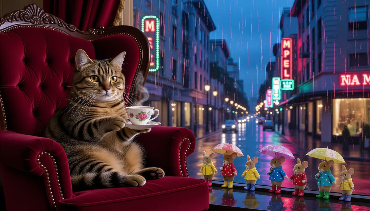 This image shows a domestic shorthair cat with amber eyes sitting on a crimson velvet armchair, holding a teacup. Volumetric lighting illuminates the scene, with a view of a bustling animal marketplace outside a rain-streaked window.