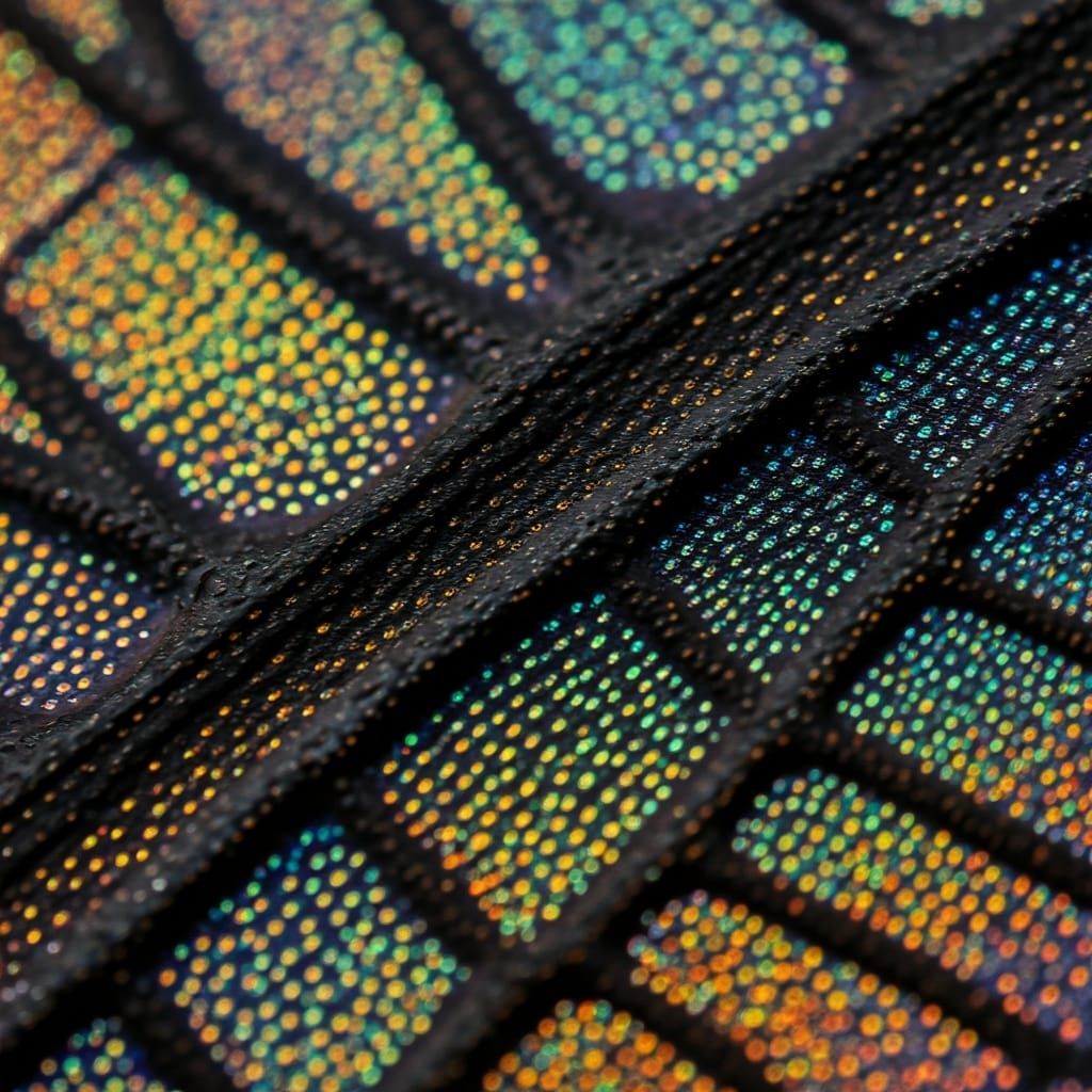 This image shows a macro photograph of the textured, iridescent wing of a butterfly. The image is rendered in high resolution with cosmic holographic elements, in the style of mixed media.
