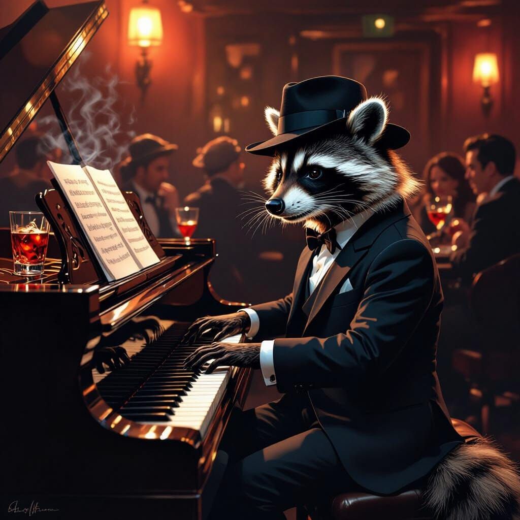 This image shows a raccoon in a suit and fedora playing piano in a jazz club. The artwork's noir style features dramatic lighting, deep shadows, and rich textures.
