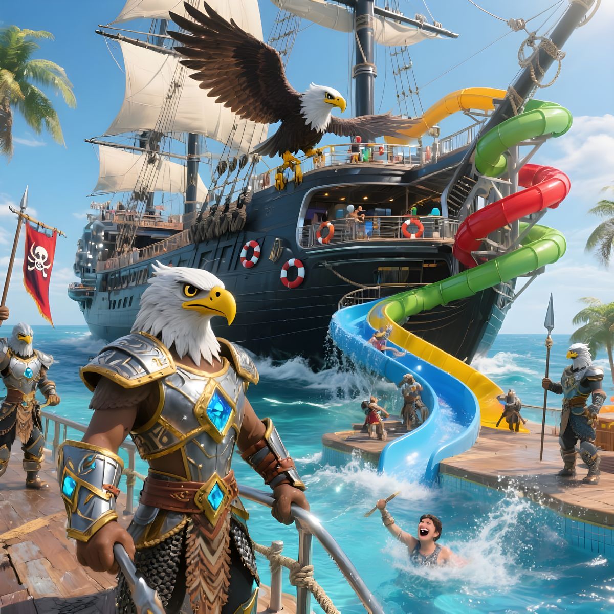 This image displays a colossal futuristic pirate ship reimagined as a vibrant aqua park on a sunny tropical ocean. It features massive water slides, detailed textures, and anthropomorphic eagle warriors in tribal armor.