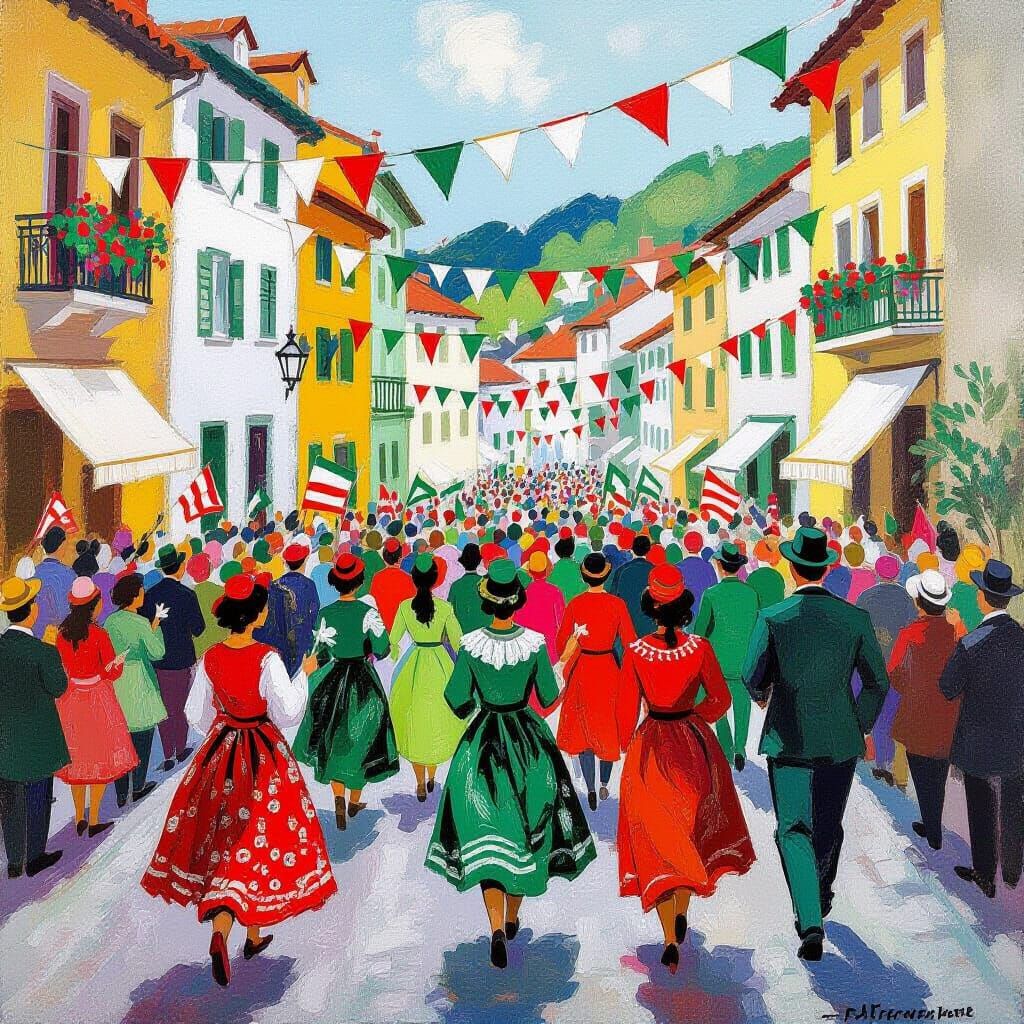 A lively street celebration featuring people in green and red, with buildings decorated in festive colors and flags. The image captures a joyful parade in a folk art style with bold colors.