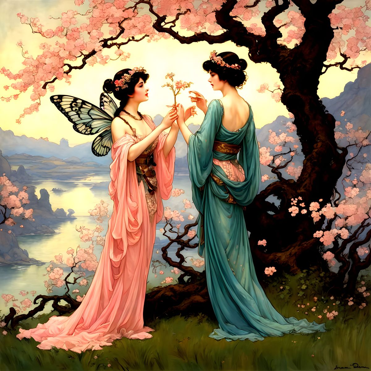 Easily design your own springtime fantasy images with our free AI art generator, featuring magical fairy couples and cherry blossom trees