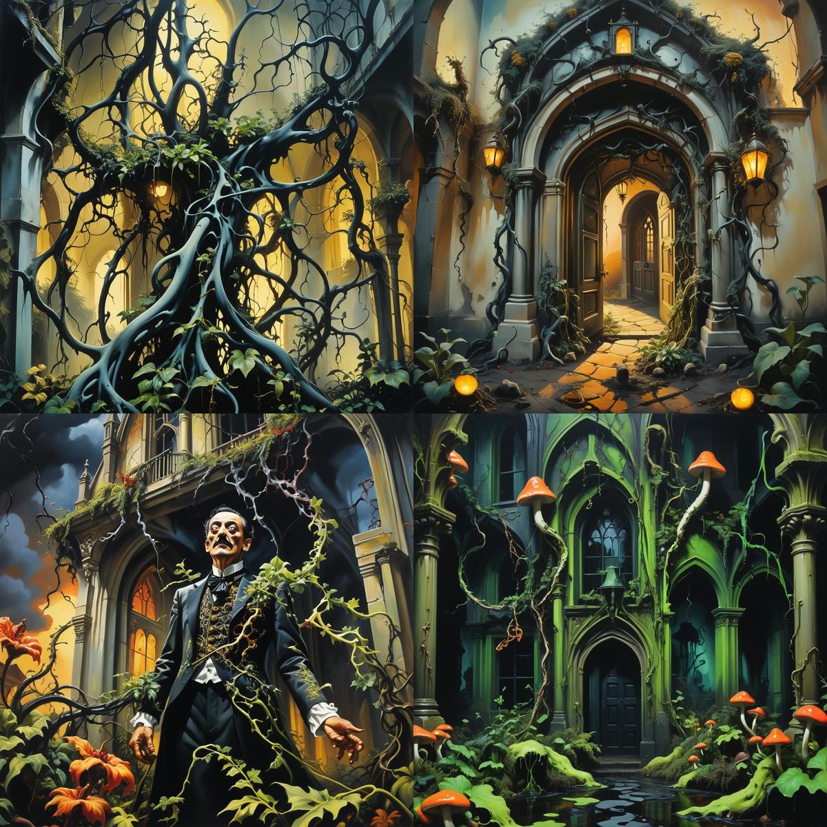 This image shows a gothic manor besieged by flesh-eating plants and ominous figures. The scene is rendered with melting, surreal elements in the style of an oil painting.