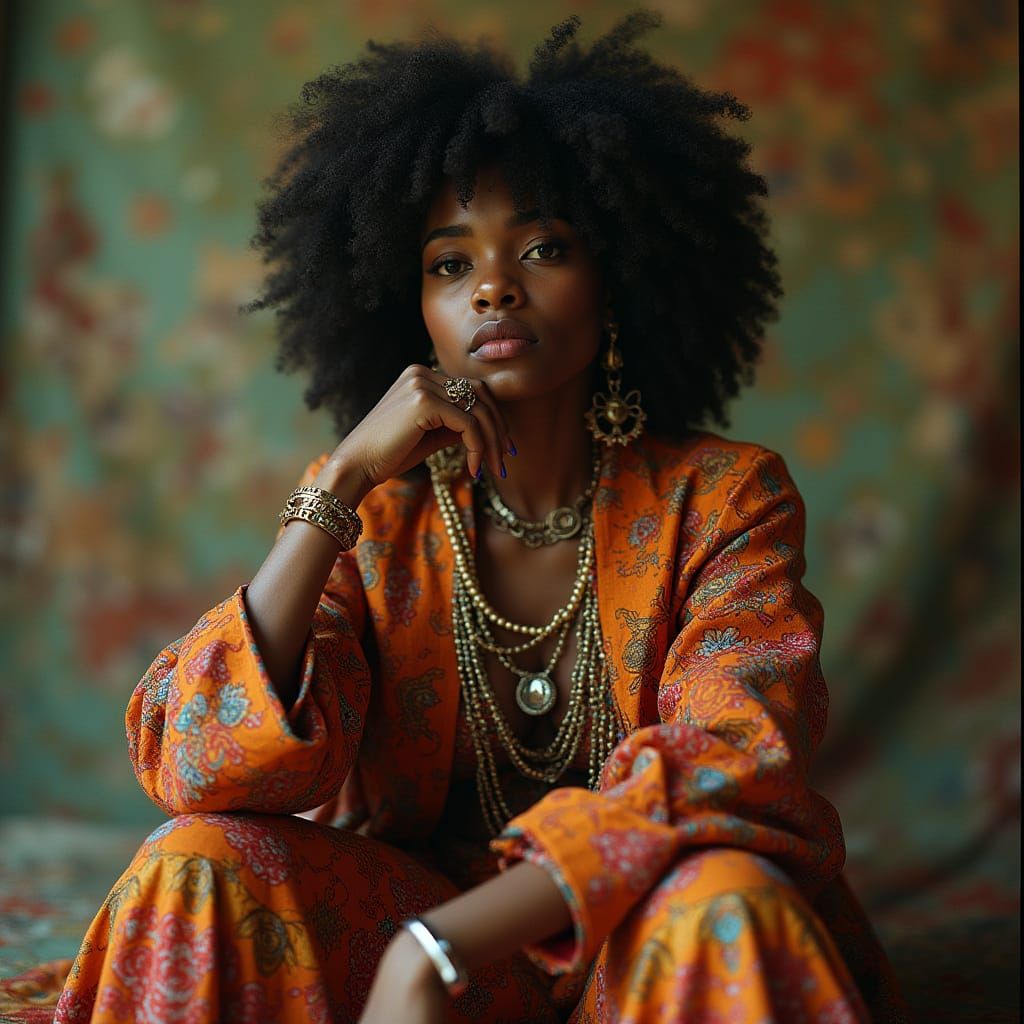This image shows an African American woman adorned with colorful attire and futuristic jewelry. The image is highly detailed with a cinematic aesthetic, reminiscent of a film still, and enhanced with advanced lighting and color grading.