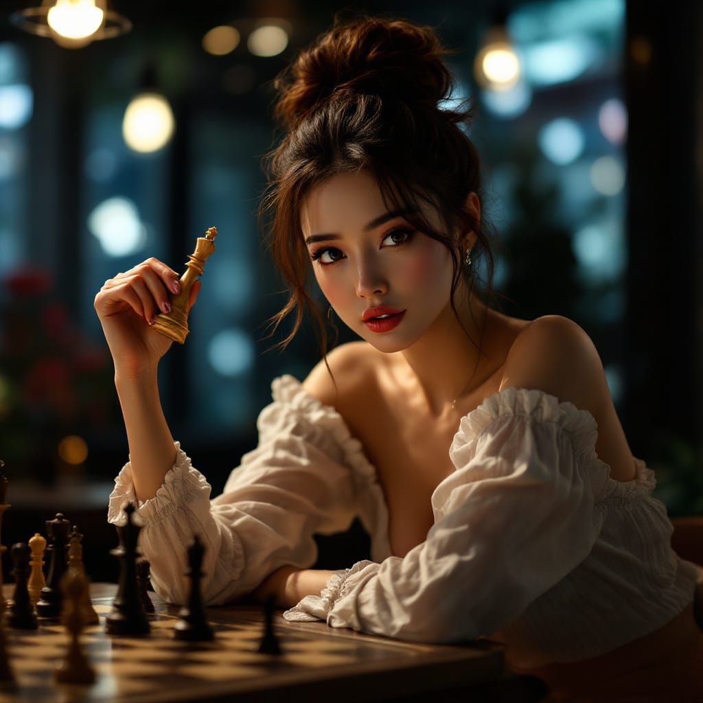 A stunningly beautiful woman plays chess in a dimly lit coffee shop. Photorealistic cinematic shot captures her alluring posture and intense gaze, holding a queen piece.