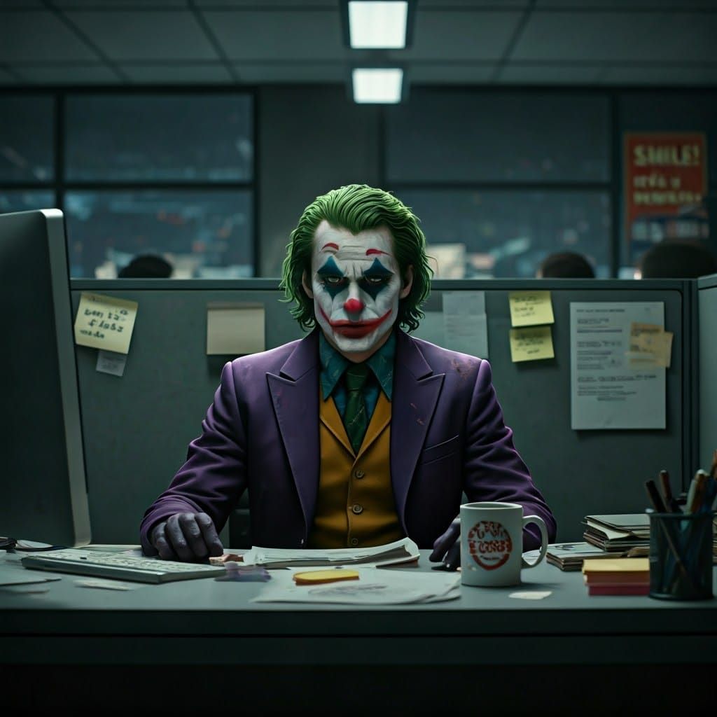 This image shows a satirical take on office life, featuring the Joker in a grey cubicle with cluttered desk and frustrated expression, surrounded by uneasy coworkers