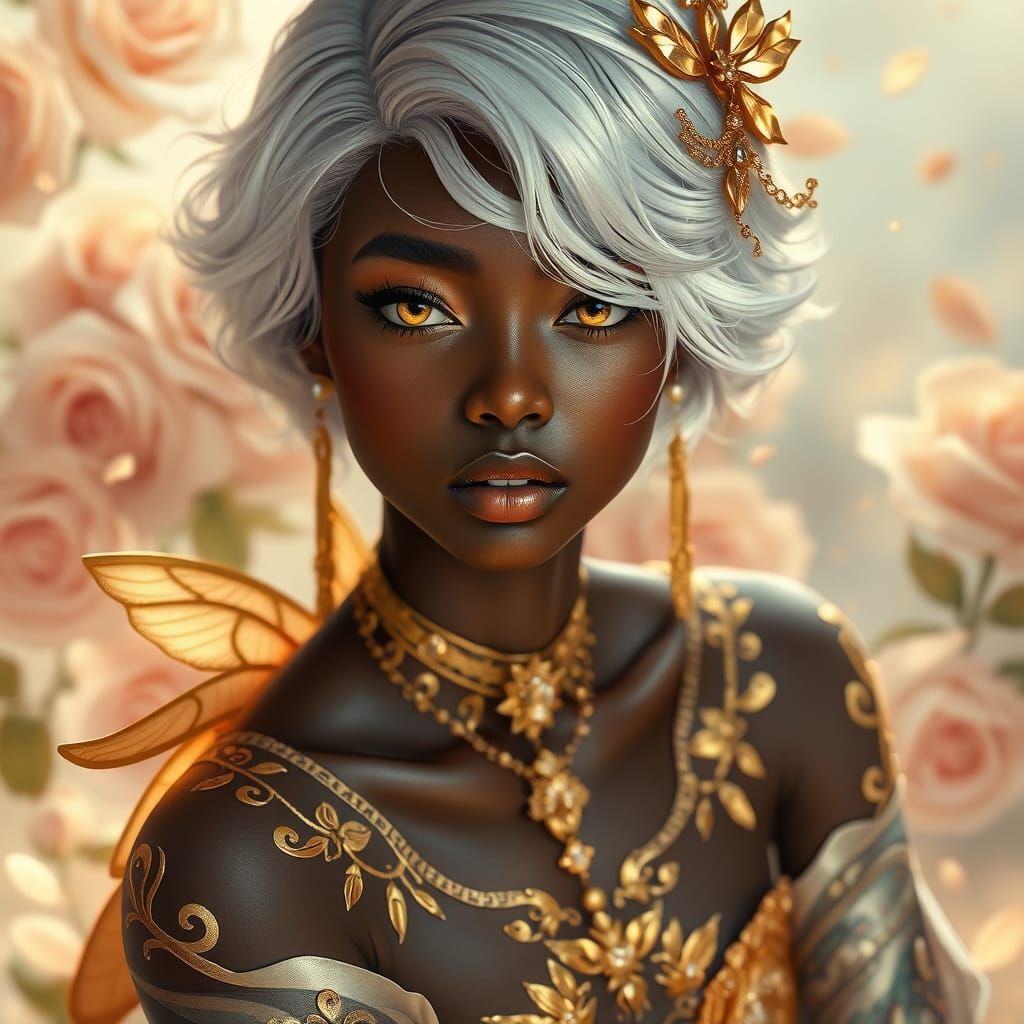 Female approximately 25 years old, with black skin makeup and gold and crystal makeup. Short, wavy white hair, styled in a fairy style, with golden wing patterns adorning her shoulders and neck. Bright yellow eyes, serene expression. Wearing fine golden ornaments, jewelry and crystal accessories on her ...