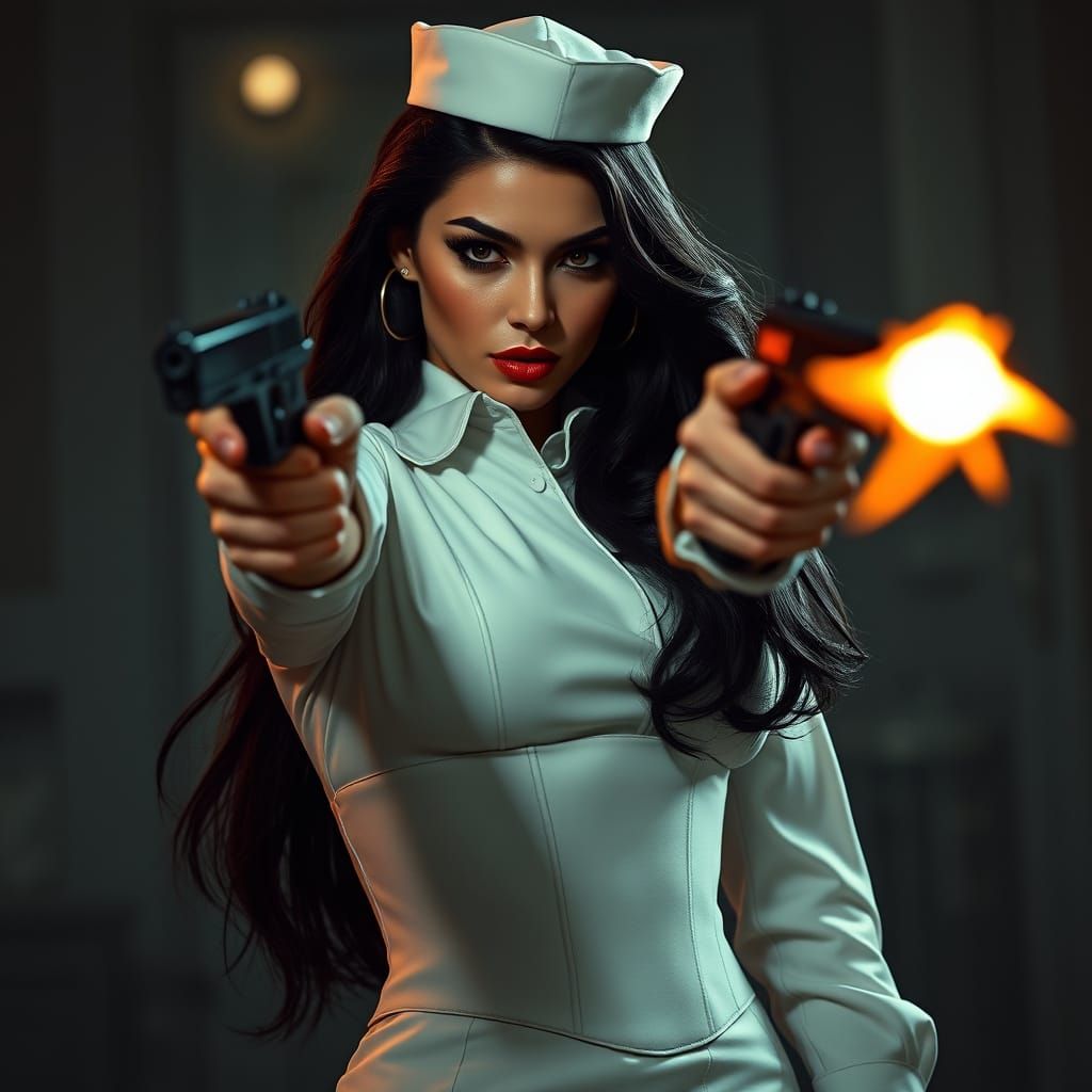 This image shows an attractive woman with long dark hair in a vintage uniform firing a handgun. The image evokes a cinematic, film noir style with bold lighting and deep shadows.