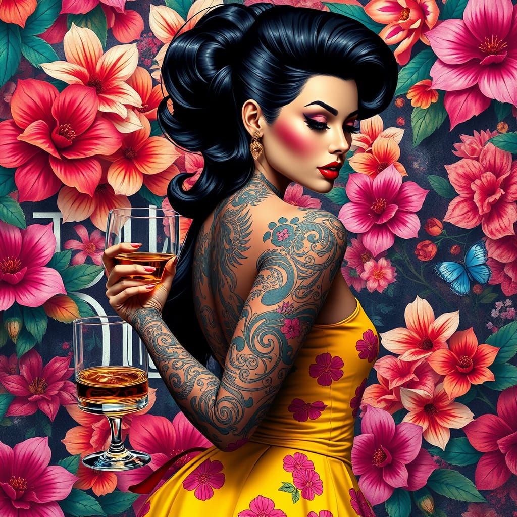 A stunning, curvaceous woman is showcased in a seductive side view, surrounded by a lush floral tapestry and dynamic street art elements, blending seamlessly into a high-contrast, polychromatic world of vibrant colors and ultra-detailed textures.