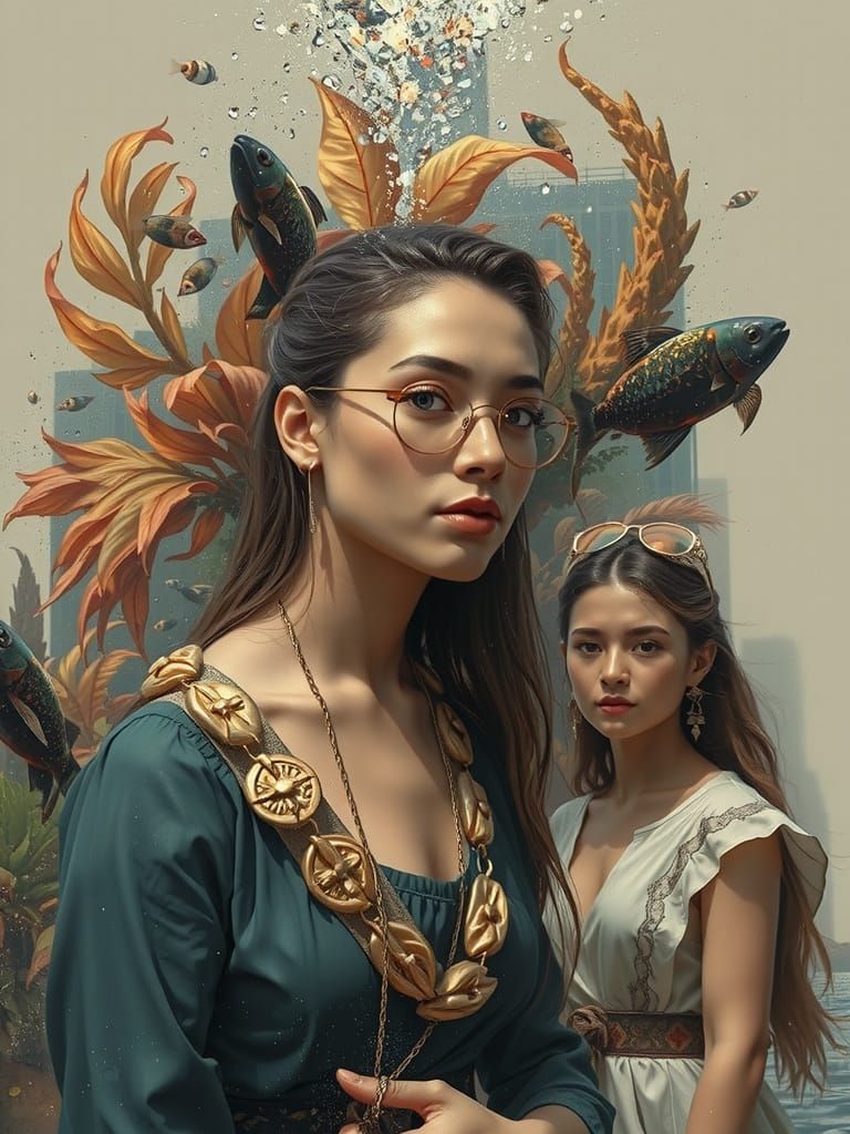 This image shows a diver surrounded by exotic fish and lush aquatic plants in the vibrant, iridescent waters of Buenos Aires' coastline, with a dreamlike cityscape in the distance, blending soft impressionist hues with gritty urban sensibilities.
