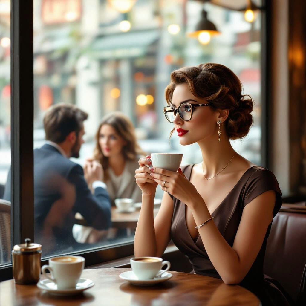 A realistic image of a woman in vintage dress and eyeglasses, seated in a coffee shop. She sips coffee while observing a couple arguing outside, captured in soft, warm lighting.