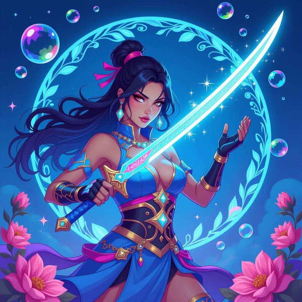 A vibrant image of a woman holding a neon blue sword, encircled by bubbles, diamonds, and floral patterns. The artwork has a decorative, mythical style.