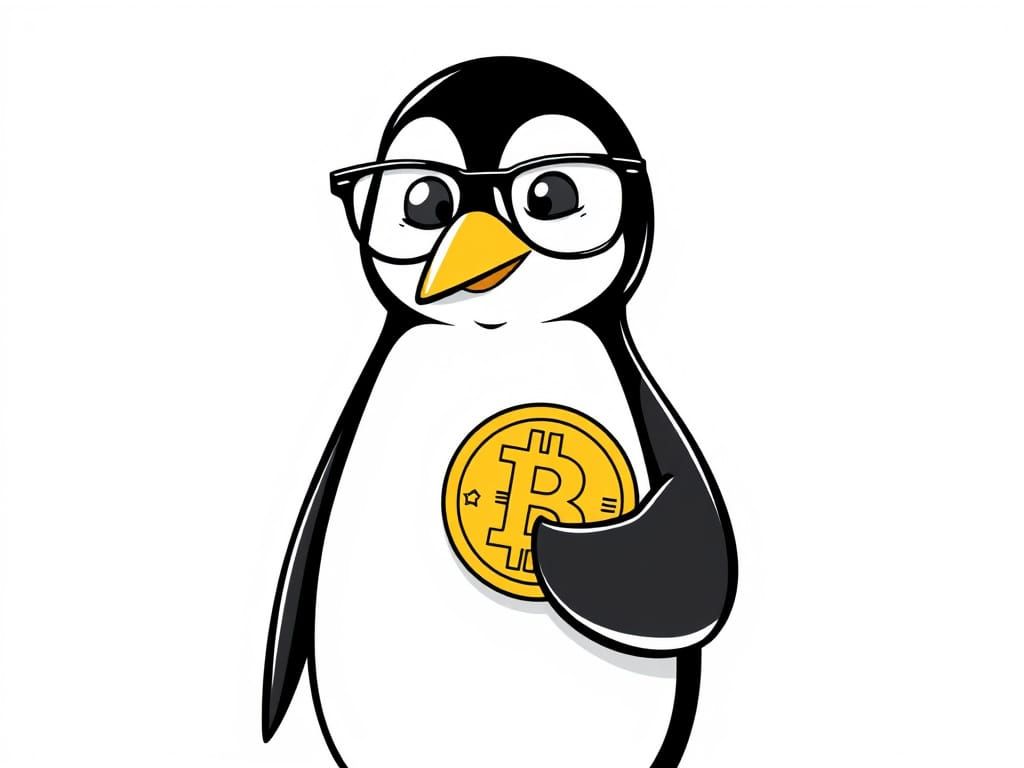This image depicts a minimalist cartoon penguin wearing glasses and examining a Bitcoin, exaggerated with fluffy cheeks and large eyes in a humorous scene against a simple white background
