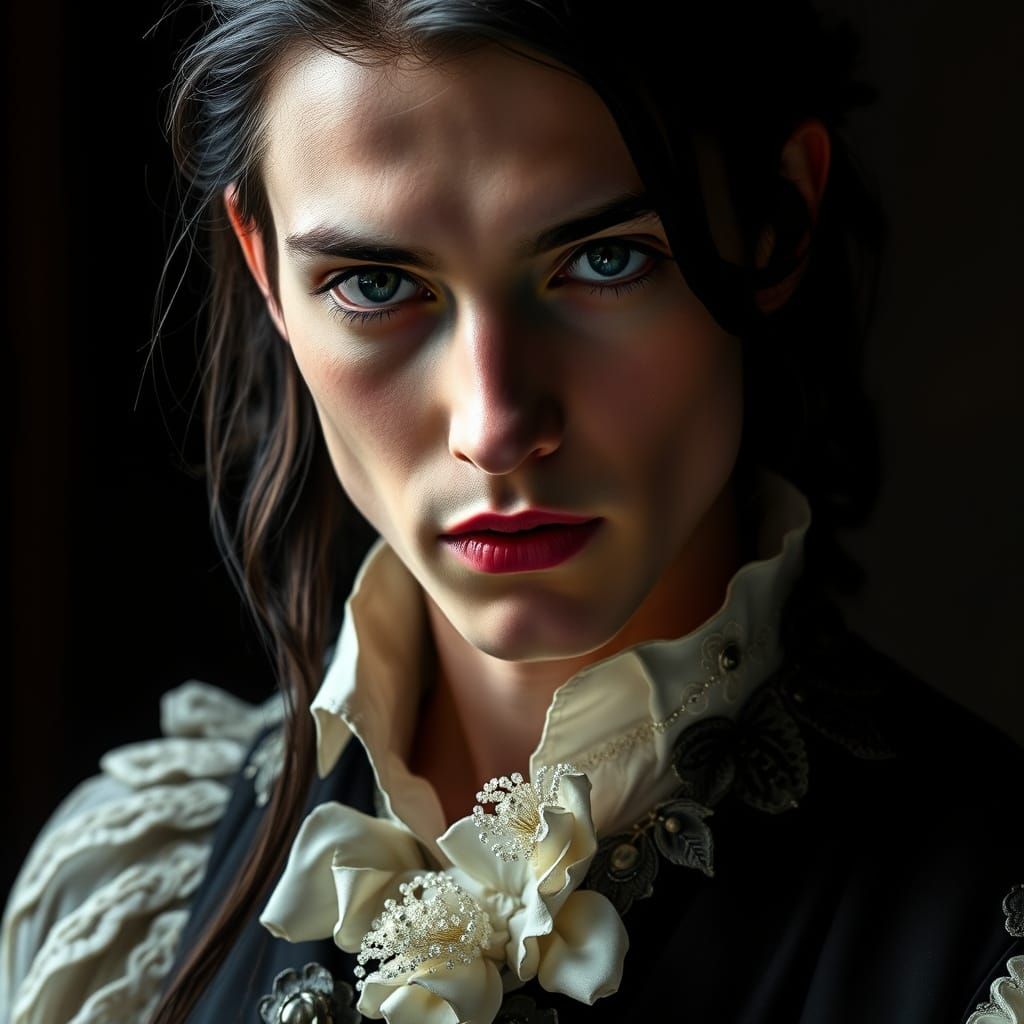 This image shows a melancholic vampire named Louis with a delicate, attractive face and dark, flowing hair. He is depicted with subtle vulnerability in dark, dramatic lighting, reminiscent of 1980s aesthetics.
