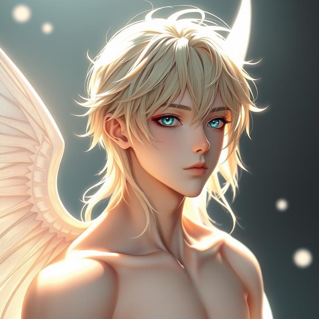 This image shows a serene male sylph with light blonde hair and delicate wings, rendered as detailed 3D anime art. The aesthetic features ultrafine detail and realistic textures.