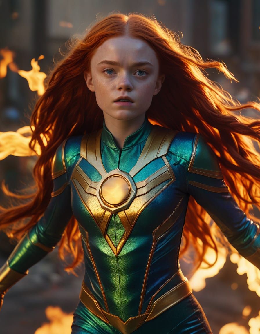 A cinematic image of actress Sadie Sink with orange skin and flaming red hair as alien princess and superheroine Starfire, from DC's Titans.