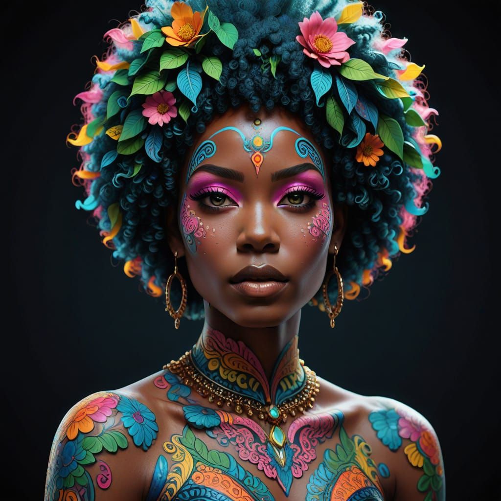 This image shows a black woman with a pink afro, adorned with vibrant, psychedelic paisley body paint. The design uses blue, green, yellow, and orange hues, set against a dark background in a 3D render.