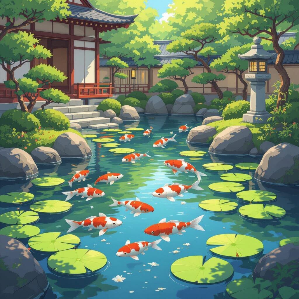 This image shows a tranquil koi pond within a traditional Japanese garden setting. Graceful koi swim among lily pads, with sunlight shimmering on the water. The art style is reminiscent of manga and anime with cel-shaded deep color.