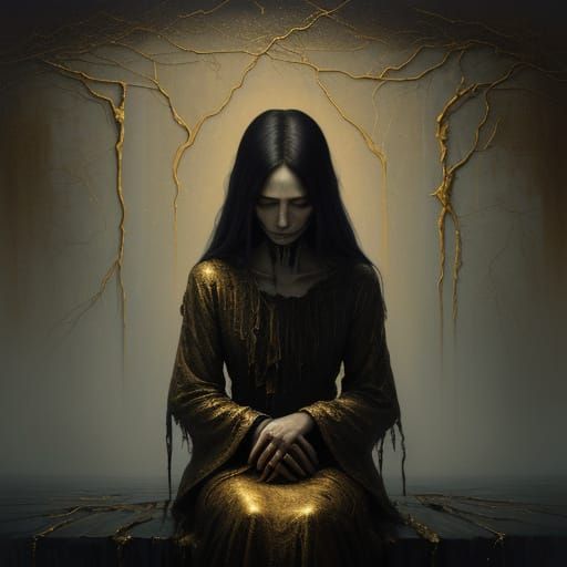 This haunting oil painting depicts a young woman overcome with emotional pain, her body cracked and broken like shattered porcelain. Soft golden light seeps through the cracks, illuminating the turmoil within. Moody, muted colors with touches of warm light create an eerie atmosphere.