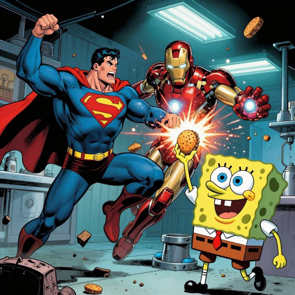 A dynamic scene depicts Superman fighting Iron Man while SpongeBob works at the Krusty Krab. Rendered in a graphic novel style with bold linework and vibrant colors.
