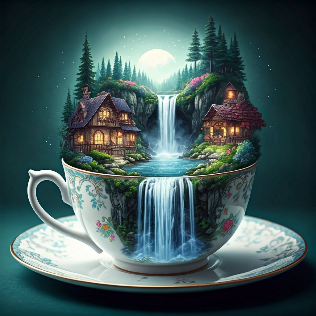 This image shows a whimsical fairytale waterfall cascading within a delicate teacup, rendered in a soft watercolor style. A magical scene of nature captured in miniature.