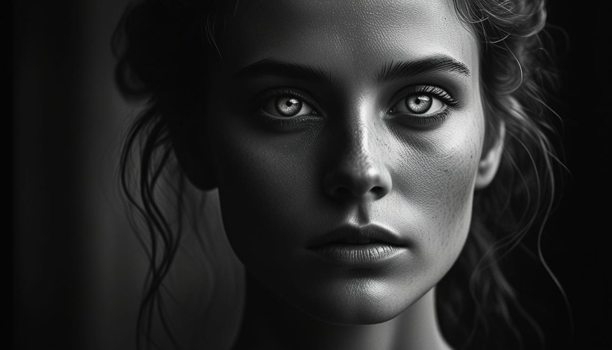 A cinematic, photorealistic medium shot of a woman with an ethereal glow. The image features intricate eye detail and dramatic lighting, showcasing a rich tonal range in black and white fine art photography.