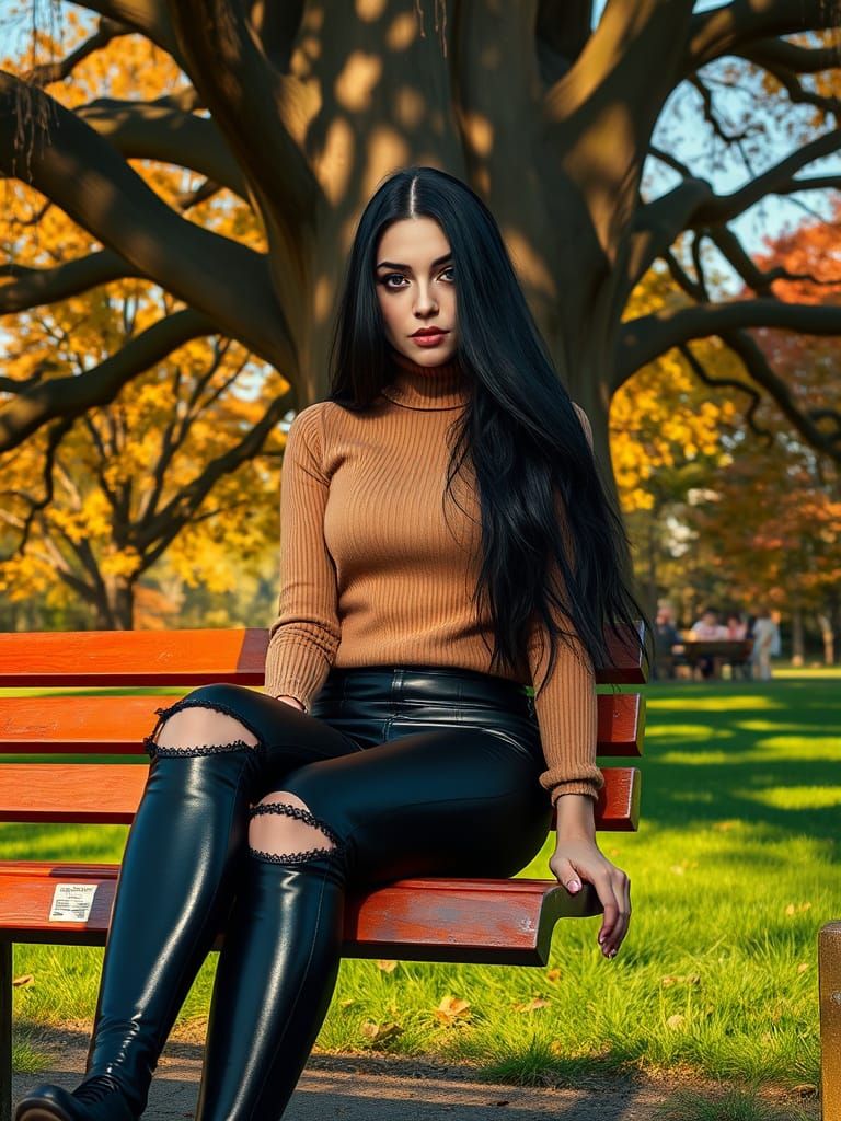 A digital painting of a woman with dark hair wearing a turtleneck and leggings, seated on a park bench. Sunlight dapples the scene, highlighting a large tree behind her, rendered with bold brushstrokes.