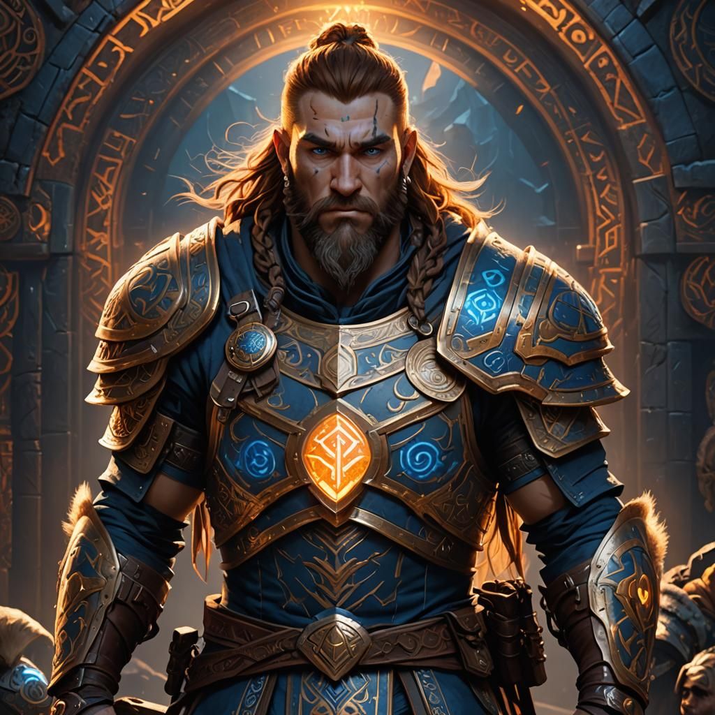 A striking picture of a male Firbolg cleric in detailed armor. The cinematic fantasy art features glowing runes and vibrant colors, enhanced by deep shadows and subtle lens flare.