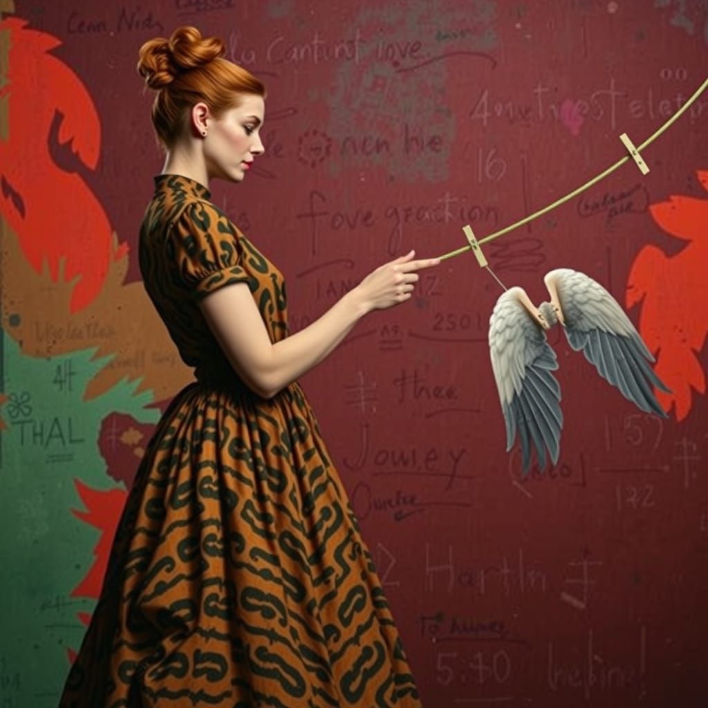 A striking digital art piece featuring a woman with large angel-like wings attached to an unbleached rope, set against a vintage wall backdrop. Created using a mix of pop art and screen print techniques, this 8K resolution artwork incorporates triadic colors and adheres to the golden ratio and rule of th...