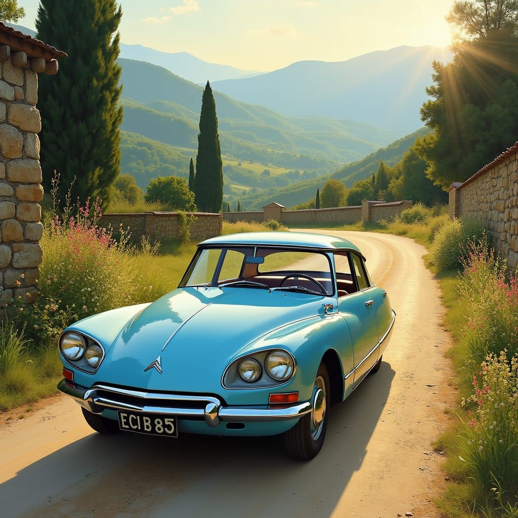 A classic light blue Citroën DS19 parked on a winding dirt road at sunset. This image captures the car's sleek design and the beauty of the surrounding countryside in an oil painting style.