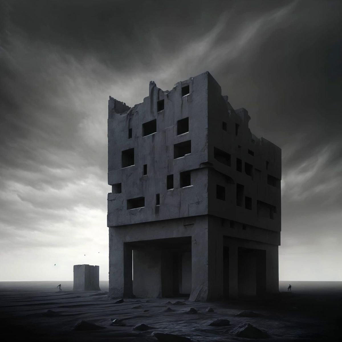This image depicts a solitary, weathered house blending brutalist concrete and ancient stone on a desolate plain. Rendered in a stark charcoal drawing style with deep shadows, it evokes dark surrealism.