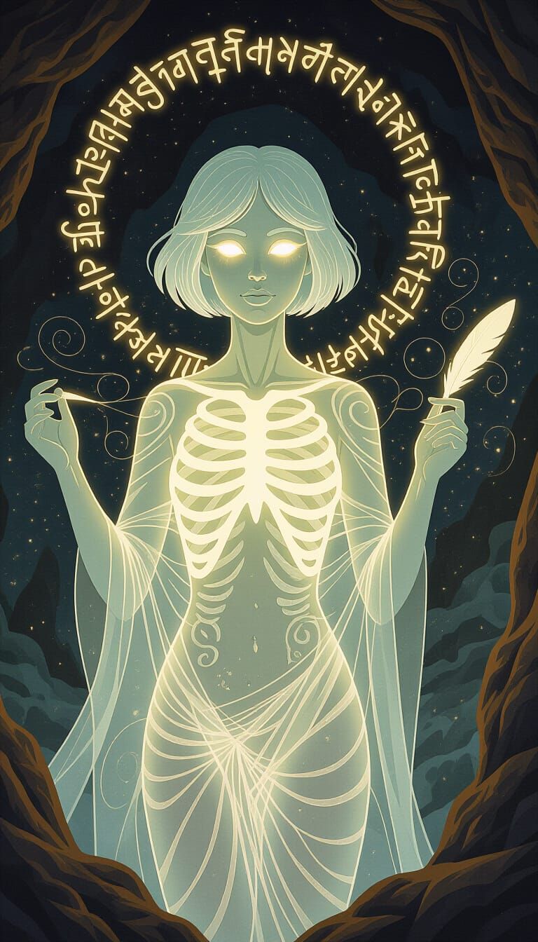 This image shows a spectral female figure in a stylized cave painting. She holds a glowing quill, surrounded by ancient script and luminous patterns, rendered with bold lines and a limited palette.