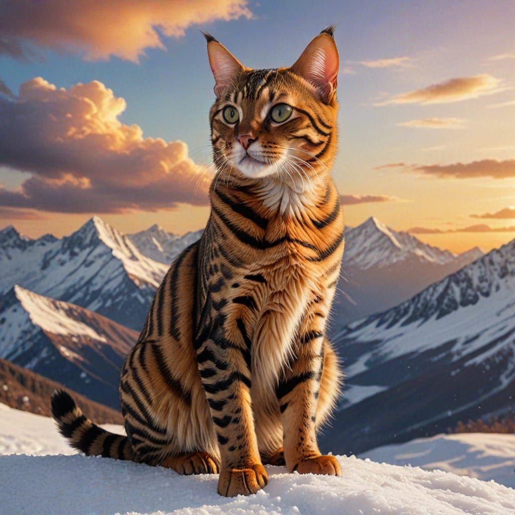 A striking picture of a Bengal cat sitting on a snowy mountain. The digital painting features soft gradients, swirling clouds, and triadic colors in a serene, majestic atmosphere.