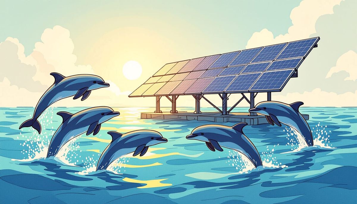 This image depicts an offshore solar panel station with several dolphins jumping around it. The artwork features a watercolor texture with pencil shading and ink lines, creating a delicate visual effect.