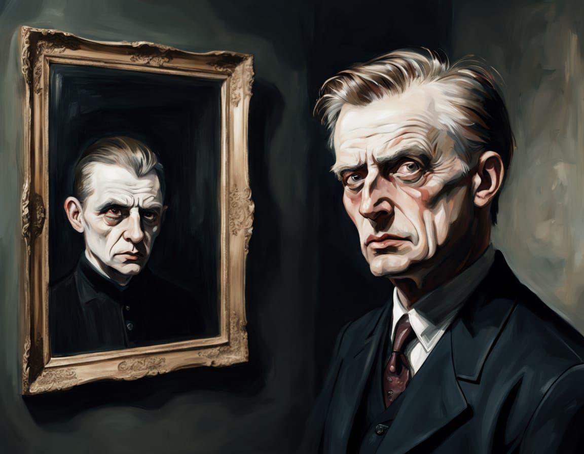This haunting image shows a fragmented self surrounded by shattered mirrors and faded images in a dark, misty environment. Faceless figures loom in the background, set against a backdrop of high-contrast shadows and muted, cold colors with a hint of golden light.