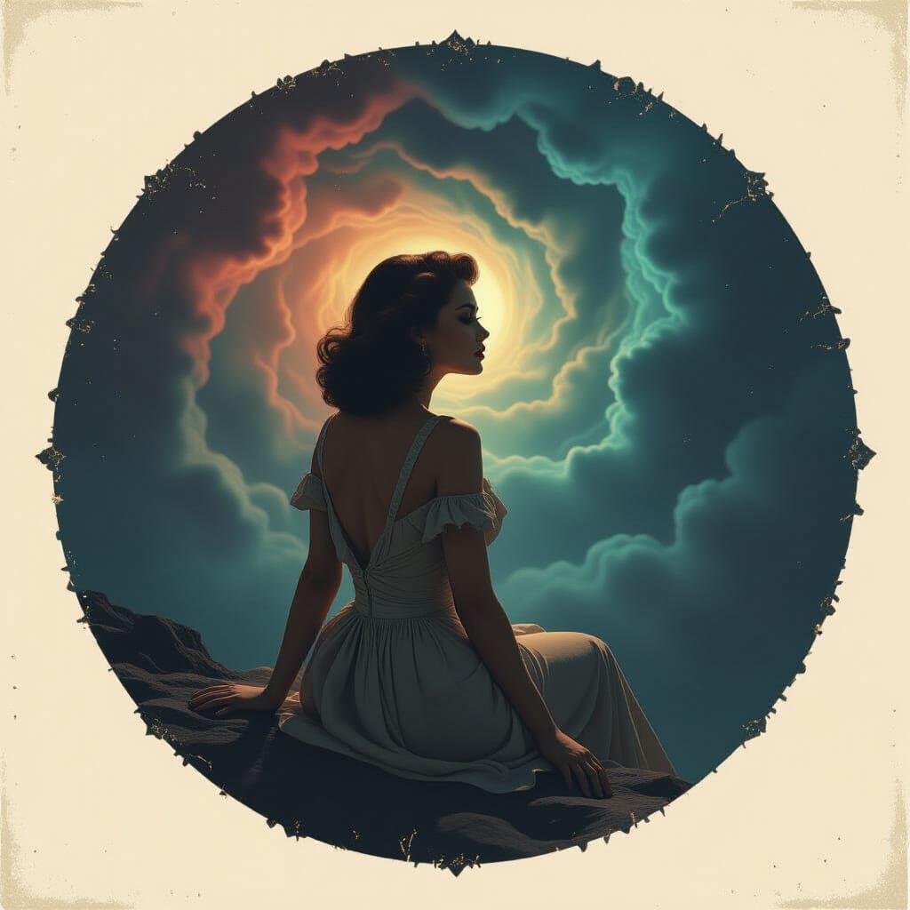 This image shows a vintage woman in a torn dress, looking into a nebula. She is surrounded by dark, swirling colors. The scene is lit with ethereal lighting, in the style of surrealist photography.