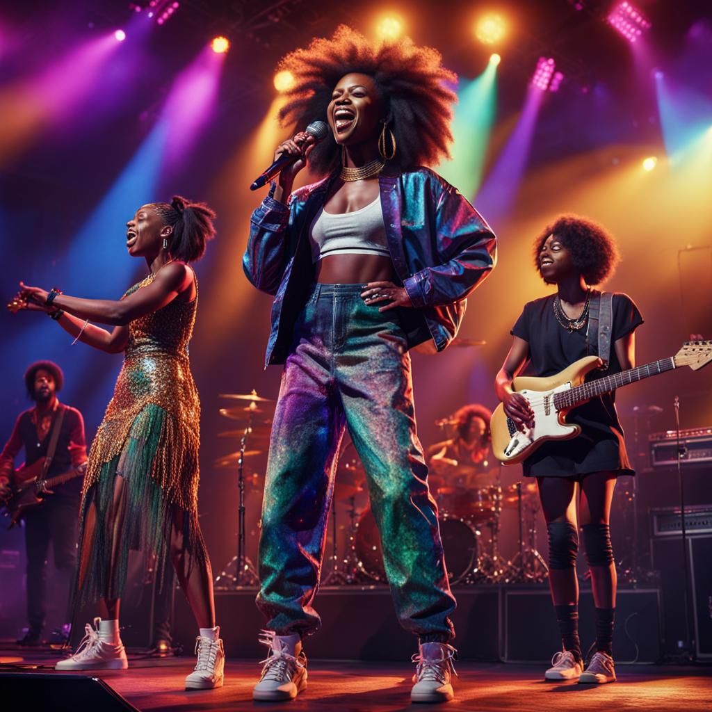 This image shows a young African American woman performing on stage with two backing singers. A band supports them before a large crowd in this detailed digital matte painting.